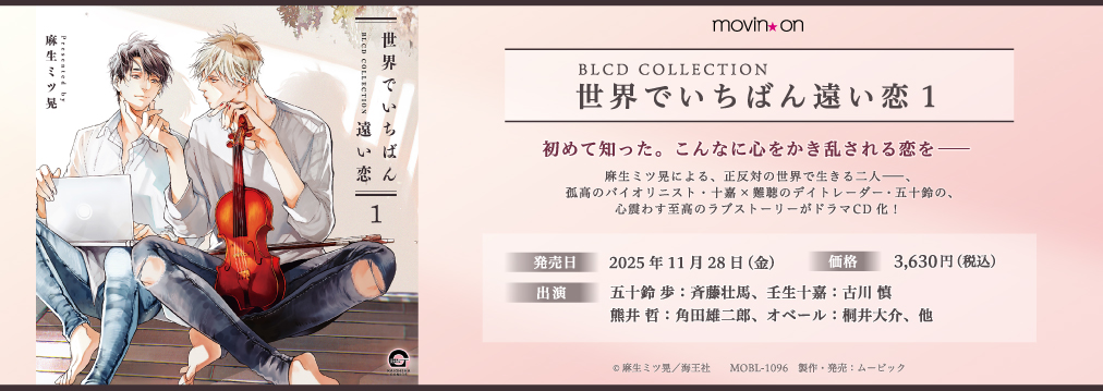 BLCDコレクション「世界でいちばん遠い恋1」音声CM 過去のTopics 2025年10月8日発売のBLCDコレクション「ピンクハートジャム beat 1」インタビュー到着! 「誰か夢だと言ってくれ」CD発売&OS開催 2024年9月27日発売のBLCDコレクション「ピンクハートジャム」インタビュー到着! 2024年7月26日発売のBLCDコレクション「宵闇シュガーキャット」インタビュー到着! 2023年11月24日発売のBLCDコレクション「友達はキスしない!」インタビュー到着! 2023年10月27日発売のBLCDコレクション「スウィートルームエスケイプ」インタビュー到着! 2023年9月29日発売のBLCDコレクション「Sub様、躾の時間です 1」インタビュー到着! BLCDコレクション10周年企画第一弾 旧譜販促キャンペーン 全タイトル 今後のリリース予定 2026/03/27 BD 【BD】悪食令嬢と狂血公爵 下巻 2026/03/25 DVD ブルーロック VS. U-20 JAPAN 1 2026/03/25 DVD ブルーロック VS. U-20 JAPAN 2 2026/03/25 DVD ブルーロック VS. U-20 JAPAN 3 2026/03/25 DVD ブルーロック VS. U-20 JAPAN 4 2026/03/25 グッズ ブルーロック VS. U-20 JAPAN 全巻予約有償特典 アクリルスタンド1種:糸師 凛、糸師 冴 2026/02/27 BD 【BD】悪食令嬢と狂血公爵 上巻 2025/12/26 CD 華Doll* 4th season Human or Doll: Answer 2025/12/19 BD 【BD】舞台「誰ソ彼ホテル」 2025/12/19 BD 【BD】AVAM 2nd Anniversary ONEMAN LIVE 『Devil Up!』 2025/12/19 BD BD『劇場版 江口拓也の俺たちだって癒されたい!~香川の旅~』 2025/12/19 CD BLCDコレクション「君に降る言の葉は」 2025/11/28 CD BLCDコレクション「世界でいちばん遠い恋1」 2025/11/28 DVD DVD『木村良平のキムライズムⅤ』 2025/11/28 CD BLCDコレクション「メメントスカーレット-ripe-」 2025/11/26 CD シュガリー・ストーリー【AVAM盤】 2025/11/26 CD シュガリー・ストーリー【アニメ盤】 BD 【BD】華Doll* -Reinterpretation of Flowering- 下巻【豪華版】 2025/10/10 Are you a thinking reed? TVアニメ『華Doll* -Reinterpretation of Flowering-』のBlu-rayが上・下2巻構成で登場。 下巻には#7~12の6話分を収録。また、豪華版限定の特典CDには劇中で使用された珠玉のBGMを収録。 BD 【BD】華Doll* -Reinterpretation of Flowering- 下巻【通常版】 2025/10/10 Are you a thinking reed? TVアニメ『華Doll* -Reinterpretation of Flowering-』のBlu-rayが上・下2巻構成で登場。 下巻には#7~12の6話分を収録。 BD 華Doll* -Reinterpretation of Flowering- 豪華版 上下巻予約有償特典 アクリル推しディスク収納セット 2025/10/10 Are you a thinking reed? TVアニメ『華Doll* -Reinterpretation of Flowering-』のBlu-rayが上・下2巻構成で登場。 期間内に豪華版の上下巻両方をご予約の方のみがお申込みいただける限定グッズが登場。 お好きなCDやBlu-rayなどのディスクを飾ることができるアクリルフレームと、限定カードがセットになったプレミアムなグッズです。 CD BLCDコレクション「ピンクハートジャム beat 1」 2025/10/08 大学4年生になった灰賀(はいが)と社会人になった金江(かなえ)は、同棲をスタートさせていた。 お互いの気持ちを確かめ合いながら季節は巡り、ついに灰賀も大学生活最後の卒業ライブの日を迎える──。 ひたむきで心優しい朗らか男子×クールビューティーな男前先輩が、交際後もゆっくりふたりの時間を重ねていくハートフルラブストーリーが待望の音声化! @movic_media からのツイート 過去のNews 09/22 NEWS 10月8日発売のBLCDコレクションBLCDコレクション「ピンクハートジャム beat 1」インタビュー到着! 10/03 NEWS BLCDコレクション「ピンクハートジャム」アニメイト限定セット(アニメイト有償特典セット)特典CDのお詫びと交換のお知らせ 08/02 NEWS 「ピンクハートジャム」アニメイト限定セットについてのお知らせ 04/28 NEWS 『オトメイトパーティー2022』Blu-ray アニメイト・Amazon特典に関するお詫びとお知らせ 08/23 NEWS BLCDコレクション「僕の番はサラブレットΩ」 商品交換のお詫びとお知らせ 07/22 NEWS BLCDコレクション「SとN」バックジャケット誤植のお詫び 過去の番組 現在放送・配信中の番組はありません。