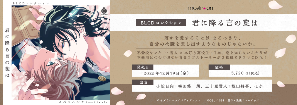 BLCDコレクション「君に降る言の葉は」音声CM 過去のTopics 2025年10月8日発売のBLCDコレクション「ピンクハートジャム beat 1」インタビュー到着! 「誰か夢だと言ってくれ」CD発売&OS開催 2024年9月27日発売のBLCDコレクション「ピンクハートジャム」インタビュー到着! 2024年7月26日発売のBLCDコレクション「宵闇シュガーキャット」インタビュー到着! 2023年11月24日発売のBLCDコレクション「友達はキスしない!」インタビュー到着! 2023年10月27日発売のBLCDコレクション「スウィートルームエスケイプ」インタビュー到着! 2023年9月29日発売のBLCDコレクション「Sub様、躾の時間です 1」インタビュー到着! BLCDコレクション10周年企画第一弾 旧譜販促キャンペーン 全タイトル 今後のリリース予定 2026年春頃予定 BD 【BD】AVAM 2nd Anniversary ONEMAN LIVE 『Devil Up!』 2026/03/27 BD 【BD】悪食令嬢と狂血公爵 下巻 2026/03/25 DVD ブルーロック VS. U-20 JAPAN 1 2026/03/25 DVD ブルーロック VS. U-20 JAPAN 2 2026/03/25 DVD ブルーロック VS. U-20 JAPAN 3 2026/03/25 DVD ブルーロック VS. U-20 JAPAN 4 2026/03/25 グッズ ブルーロック VS. U-20 JAPAN 全巻予約有償特典 アクリルスタンド1種:糸師 凛、糸師 冴 2026/02/27 BD 【BD】悪食令嬢と狂血公爵 上巻 2026/02/13 CD BLCDコレクション「息できないのは君のせい5」 2026/02/06 BD ドラマ『gift』 Blu-ray CD DJCD ハイキュー!! 烏野高校放送部! 第19巻 2026/01/30 アニメ「ハイキュー!!」と一緒に楽しむWEBラジオ、「ハイキュー!! 烏野高校放送部!」のDJCD第19弾。 新規録り下ろし音源には田中龍之介役の林勇がゲストで登場!!ファーストシーズンから劇場版「ハイキュー!!ゴミ捨て場の決戦」までを振り返りつつ、キャラクターや思い出のシーンについて語っていただきました!最終回を収録した「ハイキュー!!」ファン必聴の内容でお届けします!! @movic_media からのツイート 過去のNews 09/22 NEWS 10月8日発売のBLCDコレクションBLCDコレクション「ピンクハートジャム beat 1」インタビュー到着! 10/03 NEWS BLCDコレクション「ピンクハートジャム」アニメイト限定セット(アニメイト有償特典セット)特典CDのお詫びと交換のお知らせ 08/02 NEWS 「ピンクハートジャム」アニメイト限定セットについてのお知らせ 04/28 NEWS 『オトメイトパーティー2022』Blu-ray アニメイト・Amazon特典に関するお詫びとお知らせ 08/23 NEWS BLCDコレクション「僕の番はサラブレットΩ」 商品交換のお詫びとお知らせ 07/22 NEWS BLCDコレクション「SとN」バックジャケット誤植のお詫び 過去の番組 現在放送・配信中の番組はありません。
